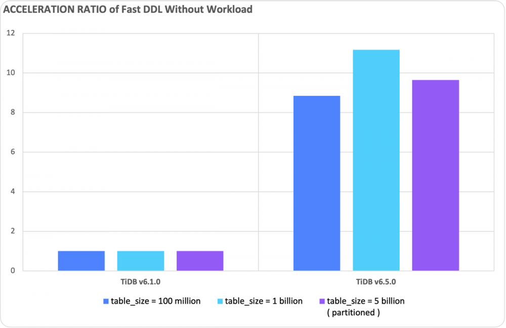 图:TiDB v6.5 在线 DDL 性能较 v6.1 提升约 10 倍