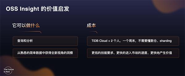 用户普遍认为,要做 OSS Insight 这样一个查询和分析的平台大概需要 4-6 个人花费半年时间。实际上,基于 TiDB Cloud,2 个人只花一个周末就可以将第一个版本推向市场。以这样的速度,企业通过 TiDB 可以领先对手几倍时间,也可以节约大量人力成本,真正做到以更低的技能要求、更快的速度将产品推向市场,从而更快产生价值。