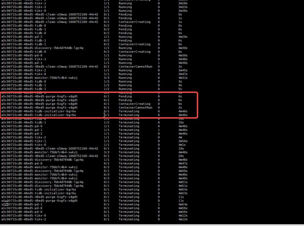 当集群出现初始化的时候整个tidb集群被删除,集群的所有pod处于termiatng状态,而且通过后端删除tidb的时候pod无法删除。