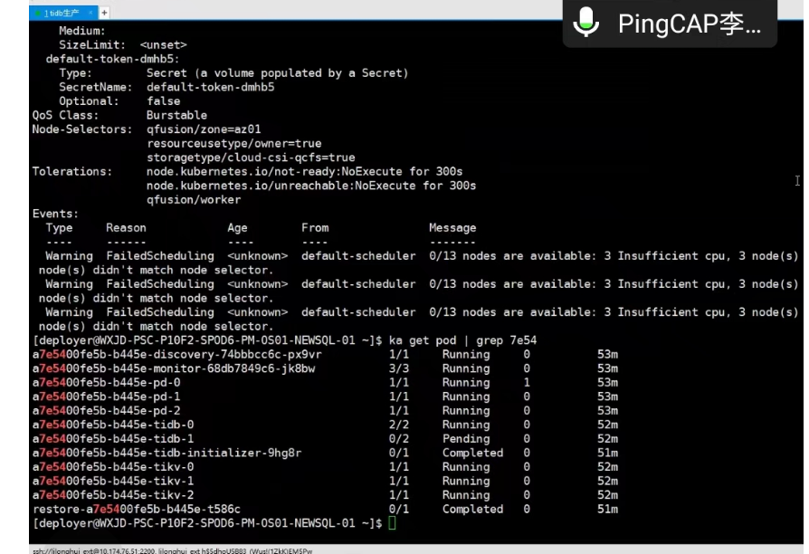 2.后经describe查看该pod的属性,发现cpu的计算资源不够了,可以断定该集群的资源不够了,需要扩充,后来扩充tidb正常创建。