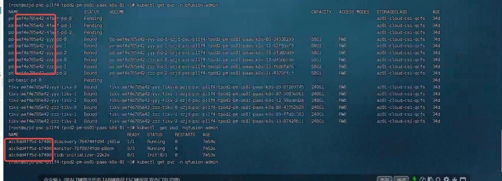 3、查看该命名空间下的pvc,发现该PVC没有正常生成,失败的原因基本断定位:tidb 各个组件的pod都没创建成功的原因是因为对应组件的pod没有找到PV绑定,pvc没有和pv进行绑定。后来和客户沟通了下,有可能是他们新上的权限功能造成的无法正常绑定pv。