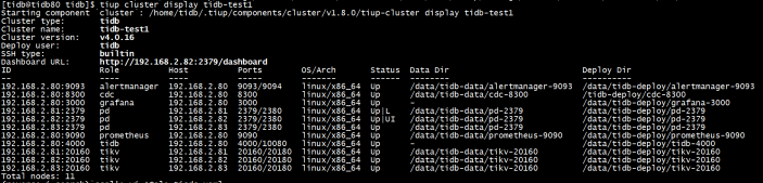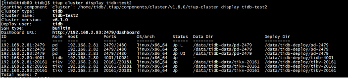 tiup cluster deploy tidb-test v6.1.0 config2.yaml tiup cluster start tidb-test2 tiup cluster display tidb-test2