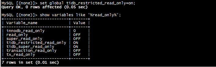 tiup cdc cli capture list --pd=http://192.168.2.81:2479 tiup cdc cli changefeed create --pd=http://192.168.2.81:2479 --sink-uri="mysql://root:root@192.168.2.80:4000/" --changefeed-id="replication-task-1" --sort-engine="unified" tiup cdc cli changefeed list --pd=http://192.168.2.81:2479 tiup cdc cli changefeed query --pd=http://192.168.2.81:2479 --changefeed-id=replication-task-19. 创建业务用户,取消只读,F5切换到(v6.1.0)集群