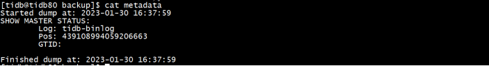 mkdir -p /tidb/backup tiup dumpling --user root --port 4000 --host 192.168.2.80 -proot --filetype sql --threads 8 -r 200000 --filesize 256MiB --output /tidb/backup --database "db1,db2,db3,db4,db5" >> /tidb/backup/dumpling.log cat /tidb/backup/metadata以上命令中: