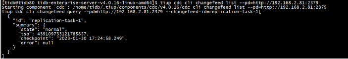 Bash scale-ticdc2.yaml: cdc_servers: - host: 192.168.2.80 ssh_port: 22 port: 8301 deploy_dir: "/tidb-deploy/cdc-8301" log_dir: "/tidb-deploy/cdc-8301/log"tiup cluster scale-out tidb-test2 /tidb/scale-ticdc2.yaml tiup cluster display tidb-test2