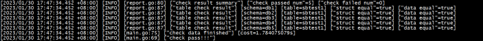 Bash sync-diff-inspector.toml: # Diff Configuration. ######################### Global config ######################### # 日志级别,可以设置为 info、debug log-level = "info" # sync-diff-inspector 根据主键/唯一键/索引将数据划分为多个 chunk, # 对每一个 chunk 的数据进行对比。使用 chunk-size 设置 chunk 的大小 chunk-size = 1000 # 检查数据的线程数量 check-thread-count = 4 # 抽样检查的比例,如果设置为 100 则检查全部数据 sample-percent = 100 # 通过计算 chunk 的 checksum 来对比数据,如果不开启则逐行对比数据 use-checksum = true # 如果设置为 true 则只会通过计算 checksum 来校验数据,如果上下游的 checksum 不一致也不会查出数据再进行校验 only-use-checksum = false # 是否使用上次校验的 checkpoint,如果开启,则只校验上次未校验以及校验失败的 chunk use-checkpoint = true # 不对比数据 ignore-data-check = false # 不对比表结构 ignore-struct-check = false # 保存用于修复数据的 sql 的文件名称 fix-sql-file = "fix.sql" ######################### Tables config ######################### # 配置需要对比的*目标数据库*中的表 [[check-tables]] # 目标库中数据库的名称 schema = "db1" # 下面的配置会检查配置库中所有的表 tables = ["~^"] [[check-tables]] # 目标库中数据库的名称 schema = "db2" # 下面的配置会检查配置库中所有的表 tables = ["~^"] [[check-tables]] # 目标库中数据库的名称 schema = "db3" # 下面的配置会检查配置库中所有的表 tables = ["~^"] [[check-tables]] # 目标库中数据库的名称 schema = "db4" # 下面的配置会检查配置库中所有的表 tables = ["~^"] [[check-tables]] # 目标库中数据库的名称 schema = "db5" # 下面的配置会检查配置库中所有的表 tables = ["~^"] ######################### Databases config ######################### # 源数据库实例的配置 [[source-db]] host = "192.168.2.80" port = 4000 user = "root" password = "root" # 源数据库实例的 id,唯一标识一个数据库实例 instance-id = "source-1" # 使用 TiDB 的 snapshot 功能,如果开启的话会使用历史数据进行对比 # 目标数据库实例的配置 [target-db] host = "192.168.2.80" port = 4001 user = "root" password = "root" ./sync_diff_inspector --config /tidb/sync-diff-inspector.toml
