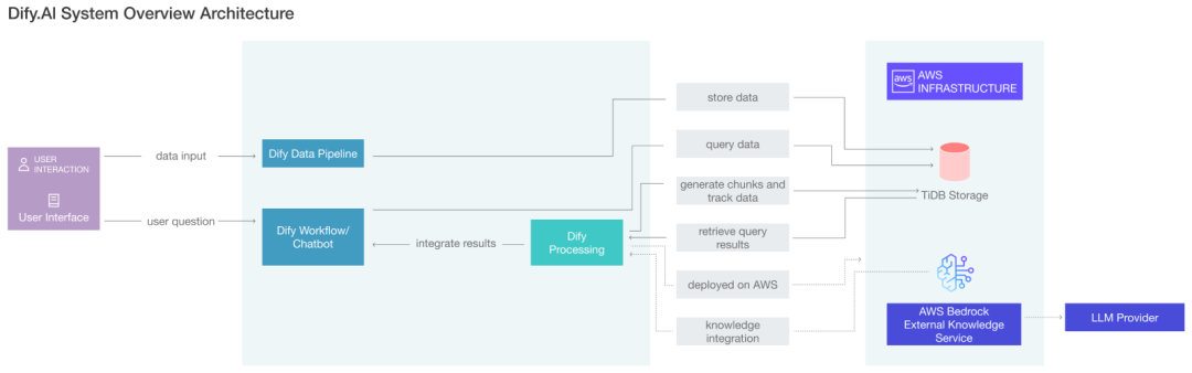 Dify.AI 的平台实现了不同类型数据与处理流程的无缝衔接,借助先进的 AI 技术将原始数据转化为有价值的信息。所有数据均统一存储于 TiDB 的存储层,并依托 AWS 基础设施进行部署,从而提升可扩展性和效率。