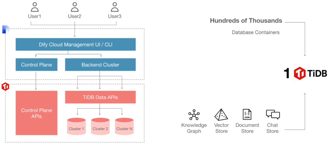 Dify.AI 将数十万个数据库整合至单一的 TiDB Cloud,极大地简化了基础设施架构,显著降低了操作复杂性与维护成本。