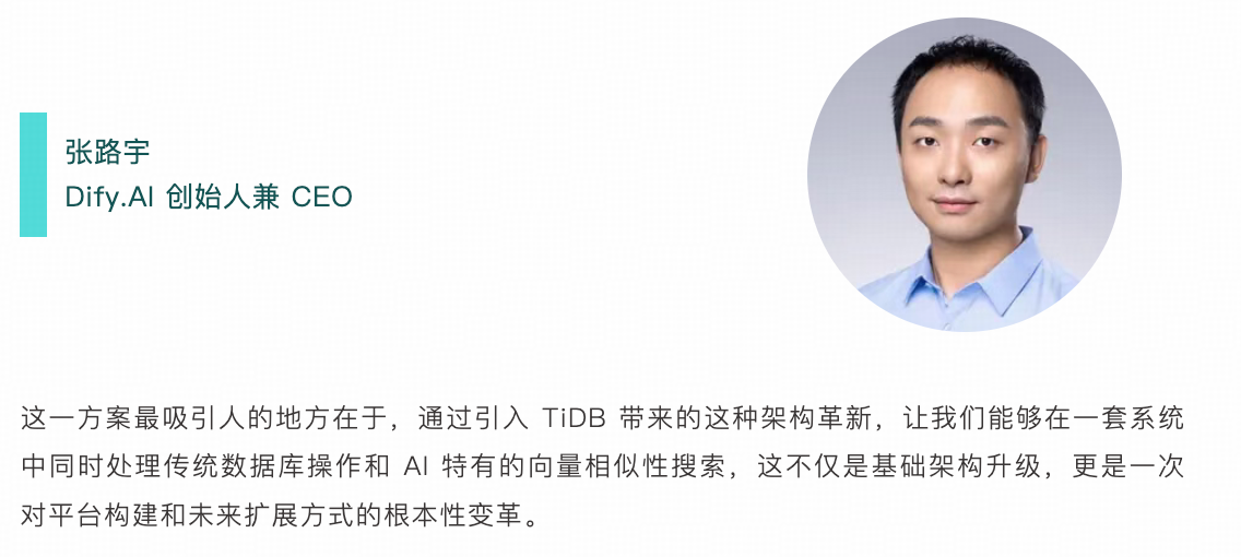 Dify.AI 团队表示:“我们与 TiDB 的合作体验非常出色。平台能够在同一个系统中处理多种需求:从知识图谱管理到文档存储,再到对话历史等,这与我们追求简化、强大的 AI 开发平台的愿景高度契合。”