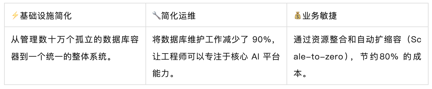 不仅如此,作为一个 SaaS 公司,数据管理的复杂性还影响了他们自身的创新能力和服务客户的效果。“管理不同数据类型的独立数据库不仅复杂,还让我们无法专注于真正重要的事情:构建更好的 AI 应用。”Dify.AI 团队表示。