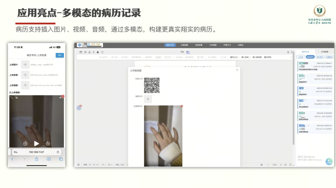 在 AI 时代,平凯数据库作为一体化数据库,支持向量数据存储和查询,为医疗场景的多模态数据管理与智能分析提供强力支撑。宜昌市中心人民医院电子病历系统依托平凯数据库,实现了图片、音频、视频等富媒体元数据的高效存储与查询——手术切口照片、医患沟通录音、康复训练视频等均可直接嵌入病历,实现了患者就诊过程的可视化追踪,并且结合向量检索技术可快速定位同类病例数据,为疗效评估提供多维参考。