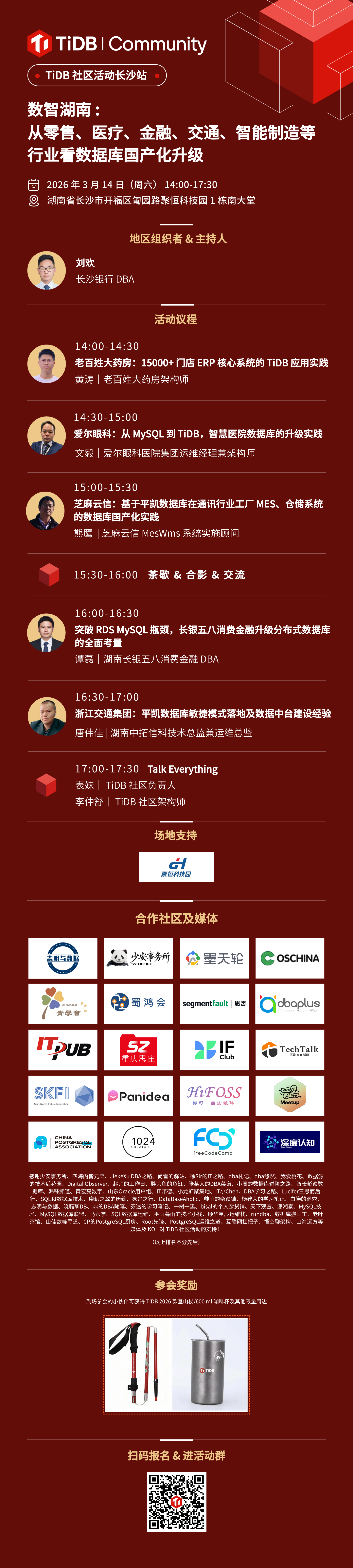 3 月 14 日,TiDB 社区开年首场地区活动即将落地长沙,携手老百姓大药房、爱尔眼科、湖南长银五八消费金融、芝麻云信、湖南中拓信科等标杆企业,聚焦零售、医疗、金融、交通、智能制造等核心领域,深度交流数据库国产化升级路径和数智化建设经验。TiDB 社区邀您新年“湘聚”,与行业实践者、技术专家共话数字化转型下的企业创新与实践!