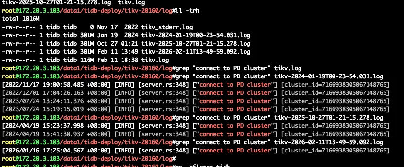 因为PD节点整个服务器已经没有了,所以现在到TiKV上的日志来查找,顺利得到了集群的cluster_id