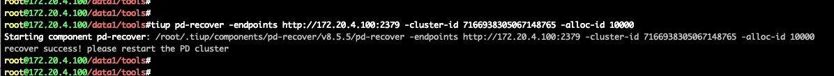 tiup pd-recover -endpoints http://172.20.4.100:2379 -cluster-id 7166938305067148765 -alloc-id 10000