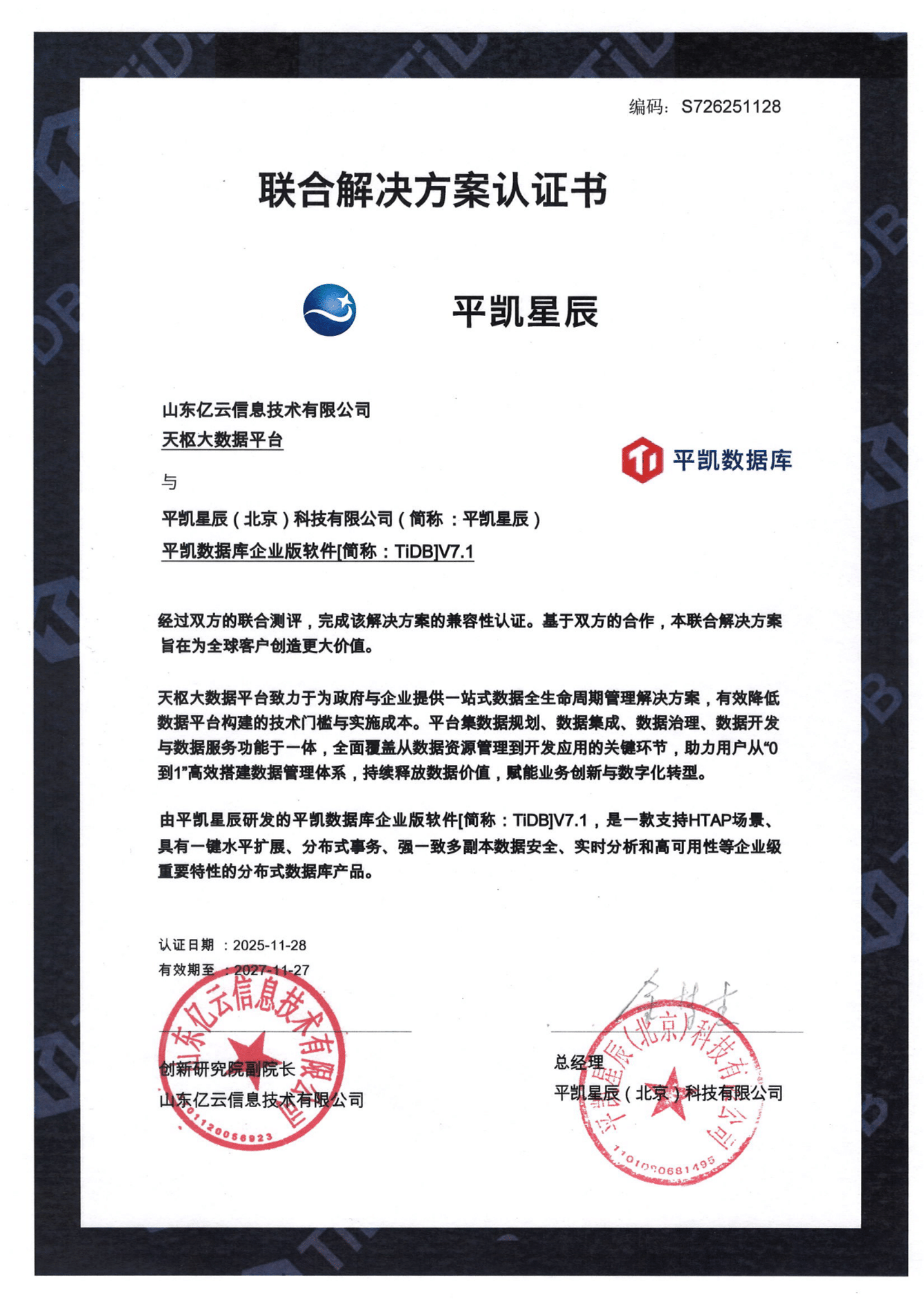 平凯数据库相关负责人指出:“政务数据治理对数据库的可扩展性、可用性及混合负载处理能力提出了极高要求。 平凯数据库很高兴能与亿云信息的天枢大数据平台完成互认证,这是国产化数据底座在政务领域的重要突破。期待双方以此次互认证为契机,共同推动政务数字化转型的国产化进程,更欢迎更多行业伙伴加入我们的合作生态,让技术创新真正赋能政务服务与社会治理。”