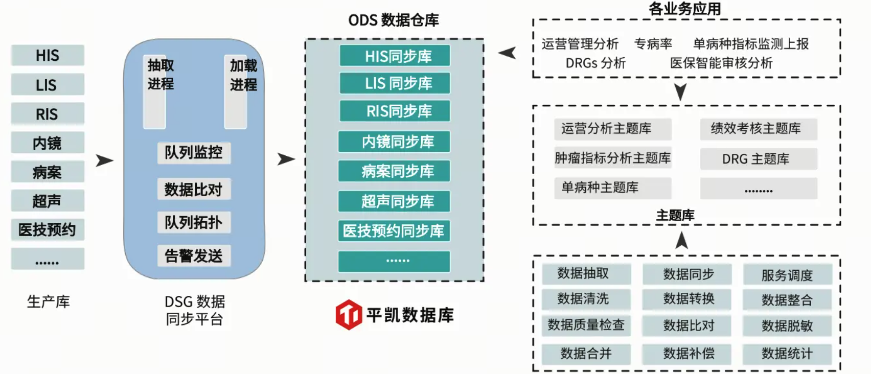 (一)数据同步与汇聚:打通 18 套生产系统的 “数据动脉”项目初期,团队重点解决 “如何将分散的生产数据实时同步至 ODS 仓库” 的问题。通过部署 DSG 数据同步平台,实现 HIS、LIS、病案、护理等 18 套生产库数据的抽取、清洗、转换与加载(ETL)。同步过程中,平台采用 “增量 + 全量” 混合模式:生产库数据变更通过日志捕获(CDC)技术实时同步至 ODS,确保秒级延迟;历史数据通过批量全量导入完成迁移,最终实现 100 多个库、40T 历史数据的完整汇聚。