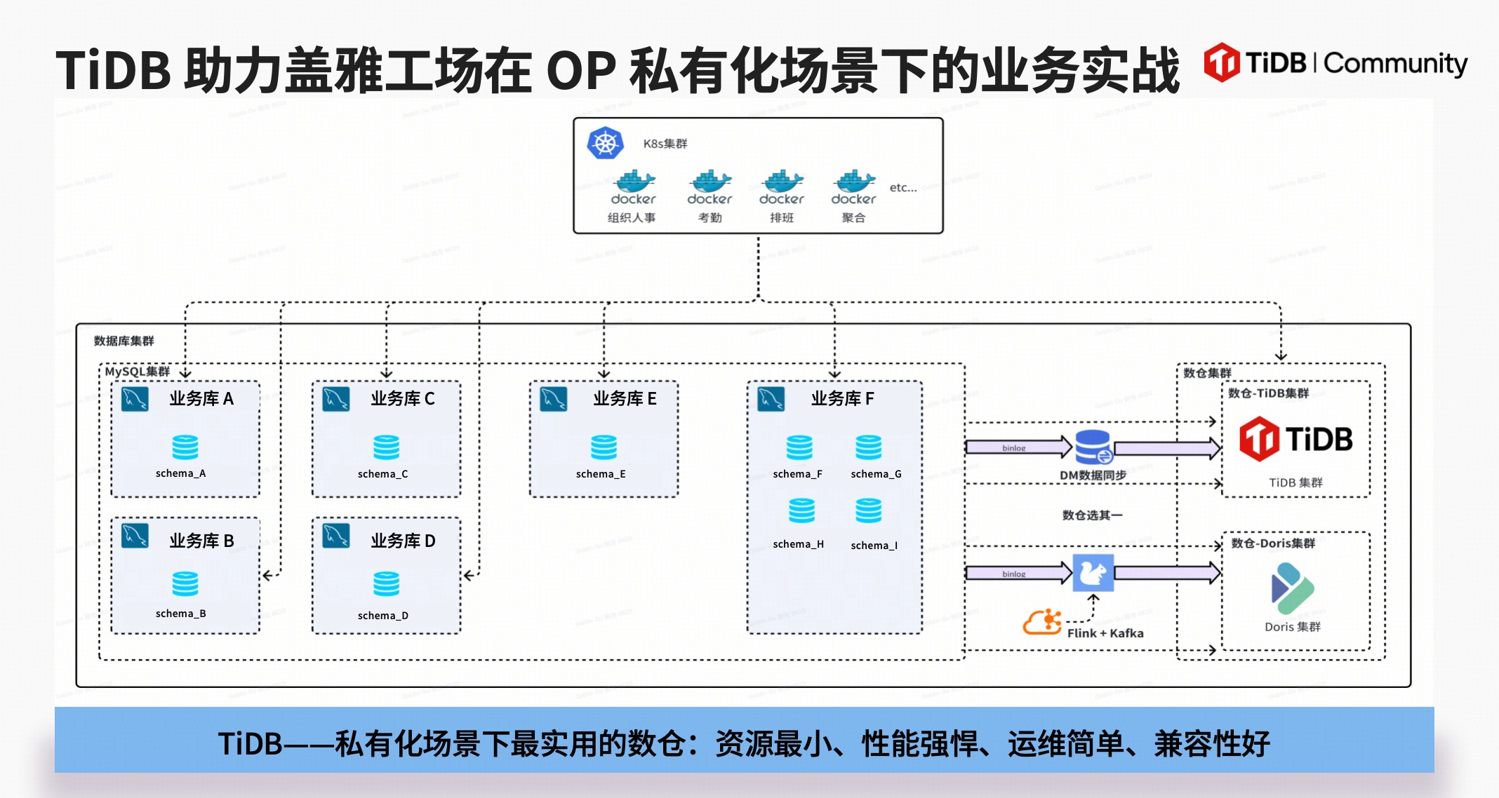- 架构精简:利用 TiDB + 运维软件DM的组合,替代了复杂的 ETL 链路,构建了最实用的私有化数仓方案。