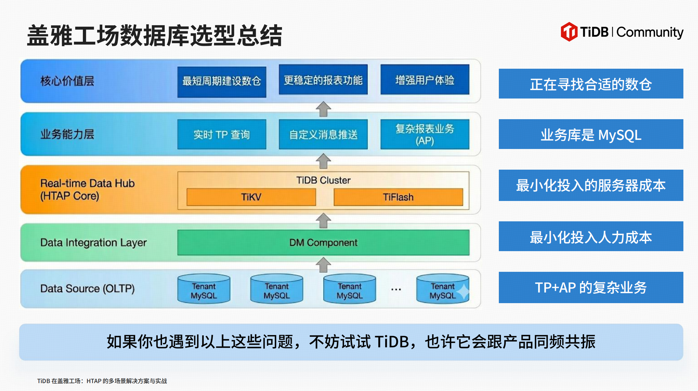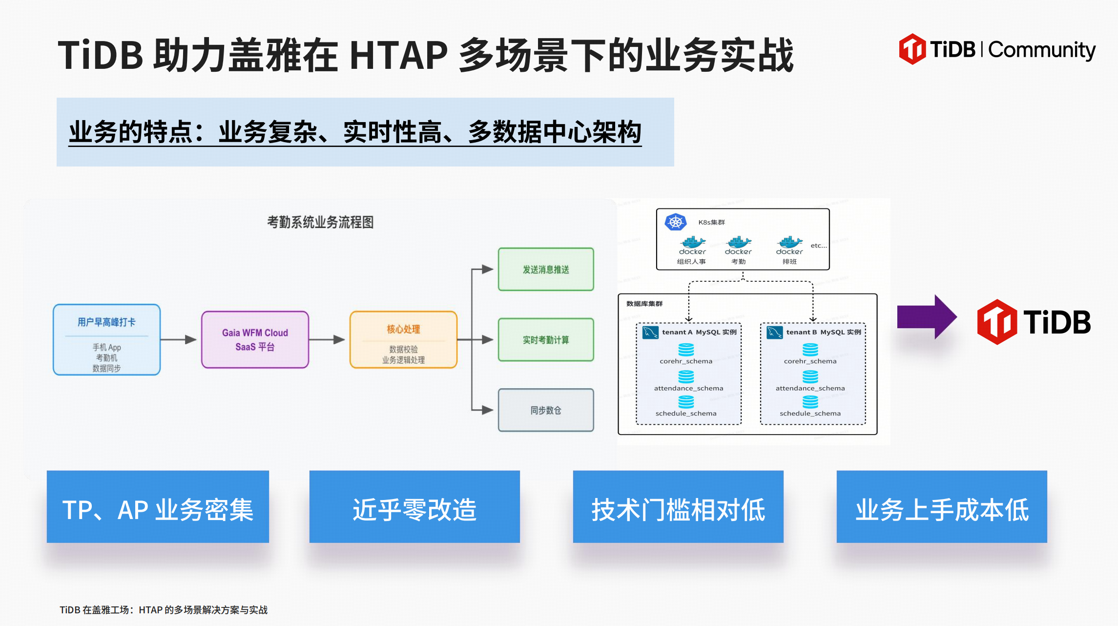 对于盖雅而言,TiDB 不仅仅是一个数据库产品,更是一个能以最小化服务器成本、最小化人力投入,支撑最复杂 TP+AP 混合业务的战略拼图。它让技术团队能够从繁重的数据运维中解放出来,专注于为企业客户提供更具价值的劳动力管理服务。