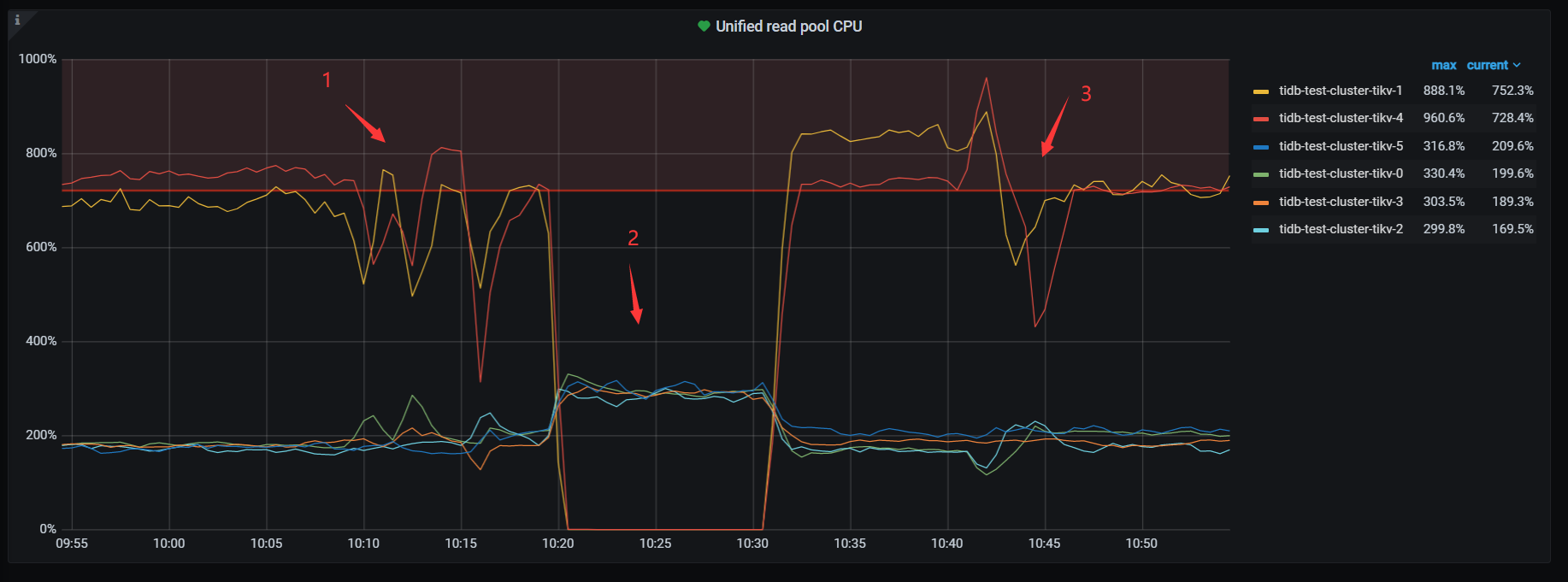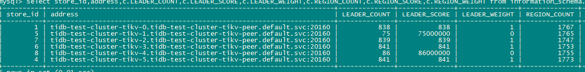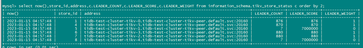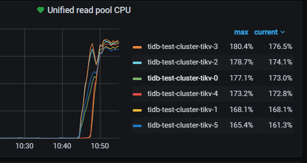 sysbench 初始化10张1亿表 然后64线程oltp_read测试,发现tikv-1、tikv-4存在热点问题。按照截图时间做了如下操作