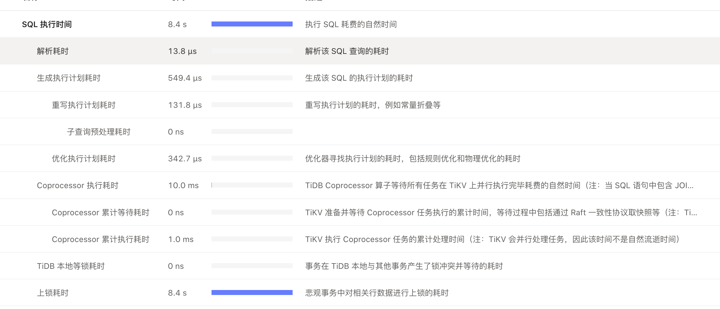 └─TableRowIDScan_10 cop[tikv] 0.09 lp, keep order:false 2 time:9.57ms, loops:4, cop_task: {num: 2, max: 572µs, min: 321.1µs, avg: 446.6µs, p95: 572µs, max_proc_keys: 1, p95_proc_keys: 1, tot_proc: 1ms, rpc_num: 3, rpc_time: 1.36ms, copr_cache_hit_ratio: 0.00}, ResolveLock:{num_rpc:1, total_time:7.99ms}, tikv_task:{proc max:1ms, min:0s, p80:1ms, p95:1ms, iters:2, tasks:2}, scan_detail: {total_process_keys: 2, total_keys: 2, rocksdb: {delete_skipped_count: 0, key_skipped_count: 0, block: {cache_hit_count: 16, read_count: 0, read_byte: 0 Bytes}}} N/A N/A