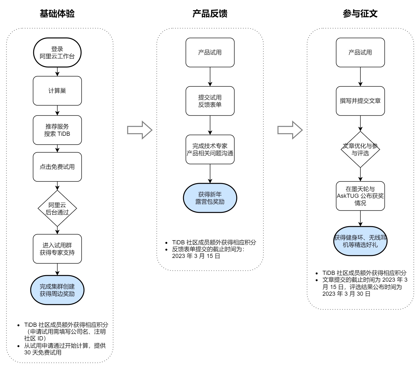参与基础体验:阿里云计算巢提供的免费试用 30 天,您可在这个期间内体验 TiDB 集群的创建、数据迁移、在线扩容、可视化运维等功能 ,遇到相关问题,均可在试用群里面获得专家支持;