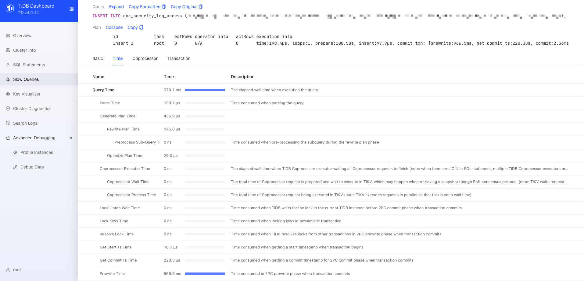 - 简单的insert语句会出现执行较慢的情况,查看热力图无写入热点,tikv节点负载均衡