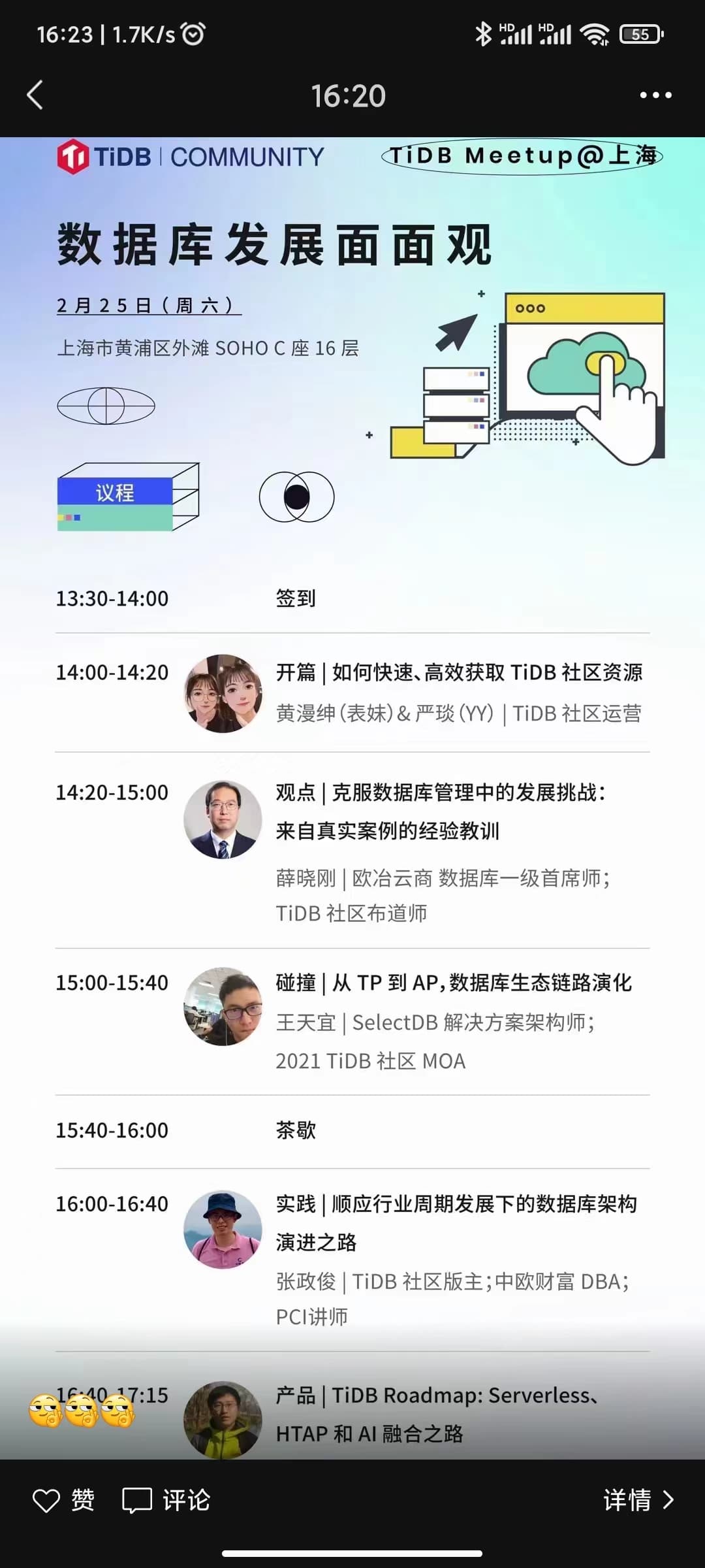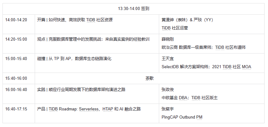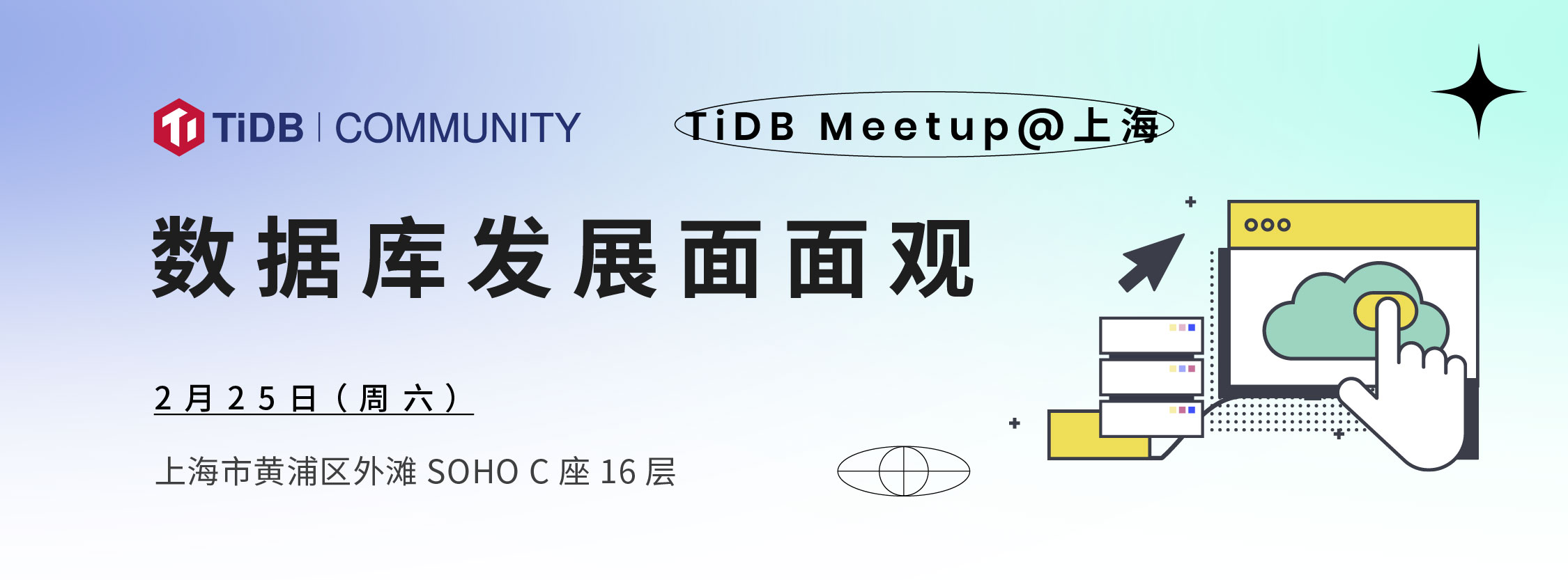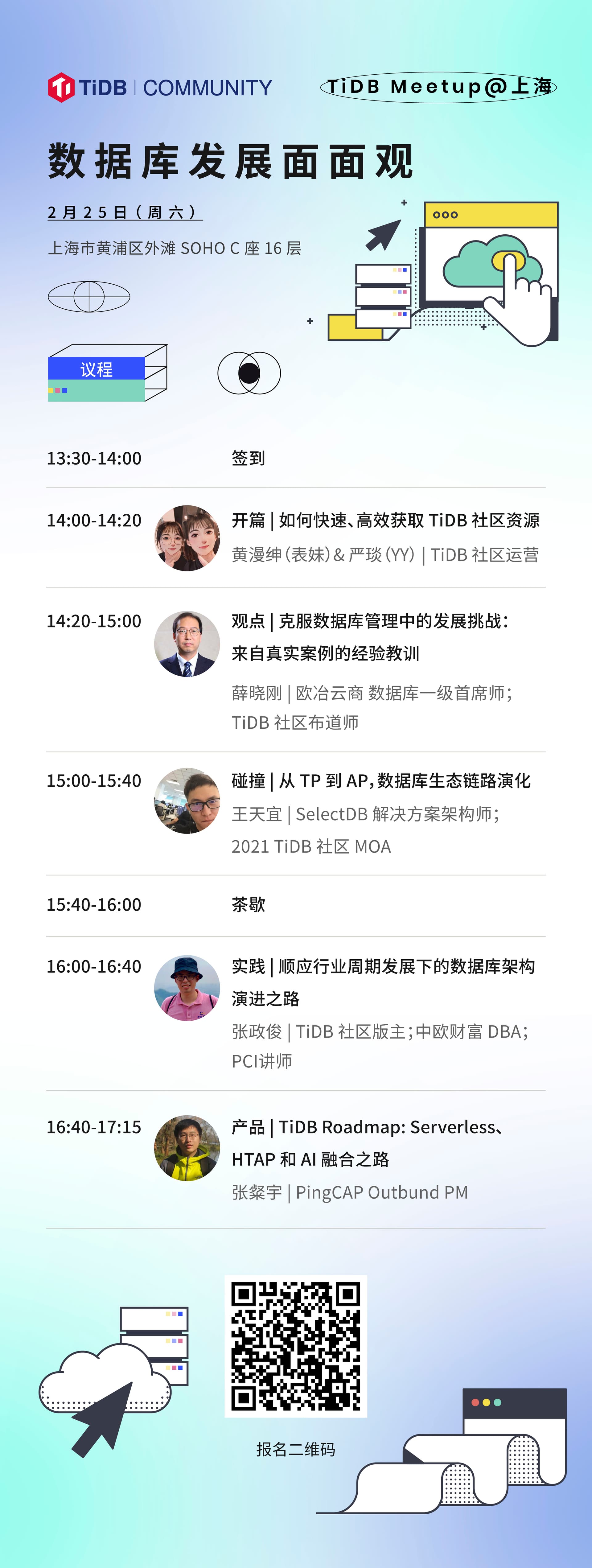 最近很多热文在朋友圈刷屏转发,很多标题党观点让大家不断热议,在看到很多小伙伴各抒己见的同时,也给了我们上海地区的组织者薛小刚 @xuexiaogang 老师一个很好的 idea,不妨组个局,听听上海当地的小伙伴大家是怎么看待这个问题。在此基础之上,我们邀请到了 TiDB 社区版主,中欧财富 DBA 张政俊老师 @HHHHHHULK 、以及社区的老朋友,来自 SelectDB 的解决方案架构师 王天宜老师 @懂的都懂 来聊聊从过去到未来,数据库生态的链路演化,以及在顺应行业周期下的 TiDB 架构演进之路,本期活动还有来自 PingCAP 的 Outbund PM 张粲宇老师将和大家分享 TiDB Roadmap,趁此机会也希望和大家一起聊聊 Serverless、与 AI 融合的 TiDB 让大家期待的发展。
