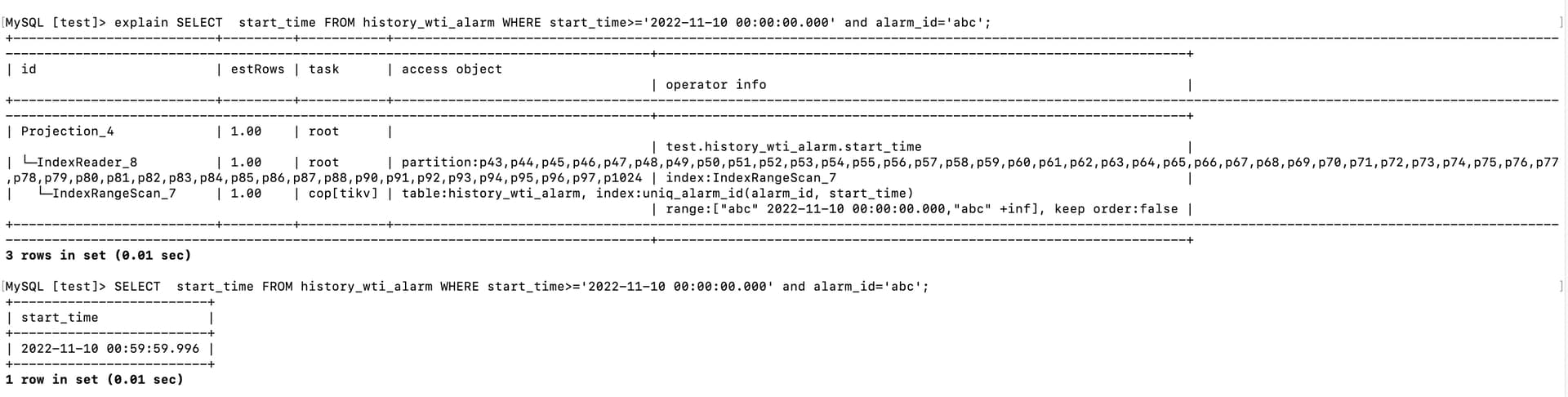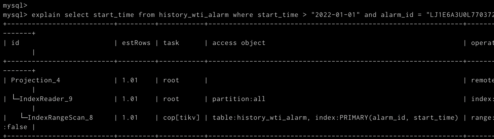 | └─IndexRangeScan_7 | 1.00 | cop[tikv] | table:history_wti_alarm, index:uniq_alarm_id(alarm_id, start_time) | range:[“abc” 2022-11-10 00:00:00.000,“abc” +inf], keep order:false |