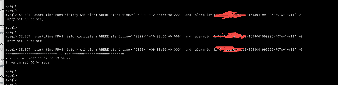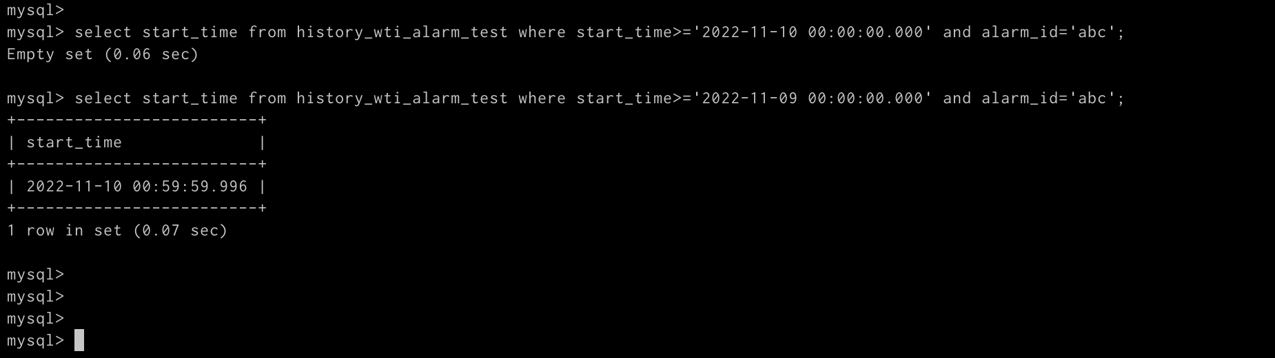 MySQL [test]> SELECT start_time FROM history_wti_alarm WHERE start_time>=‘2022-11-10 00:00:00.000’ and alarm_id=‘abc’;