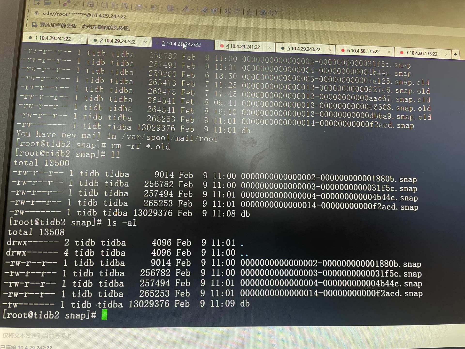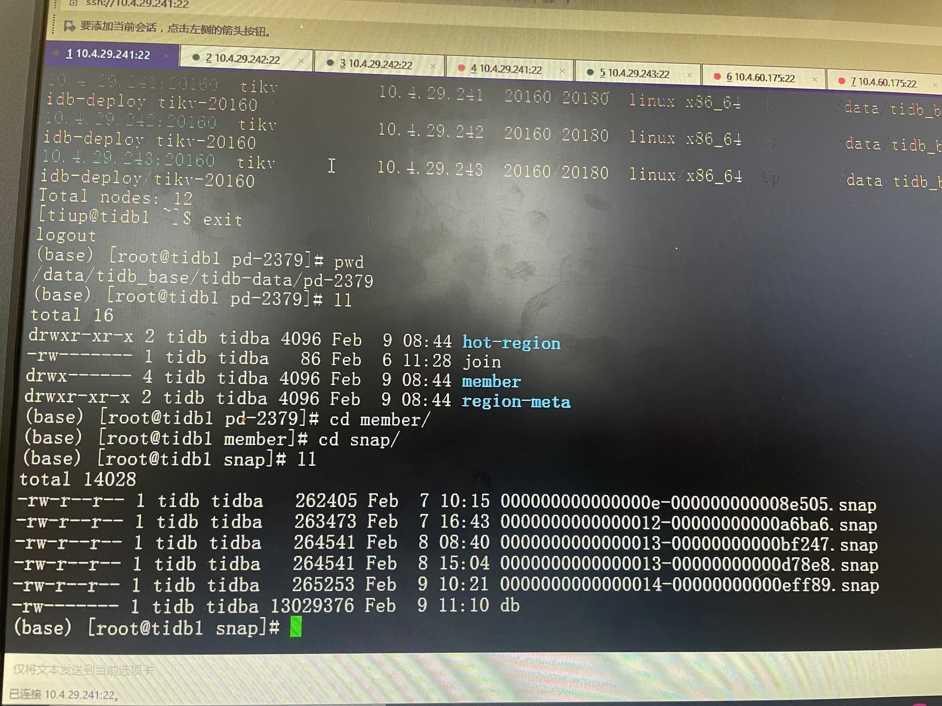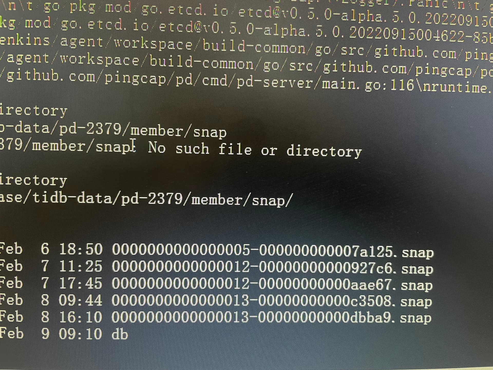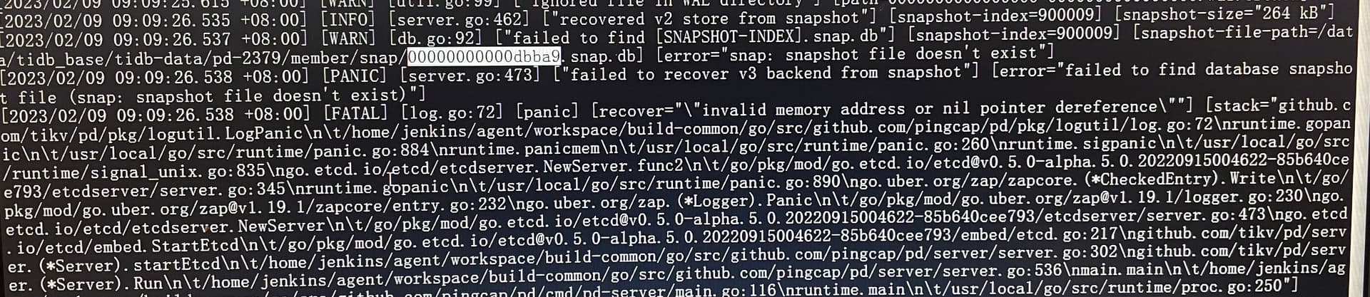 集群重启的时候pd节点启动失败日志如上图所示提示找不到00000000000dbba9.snap.db