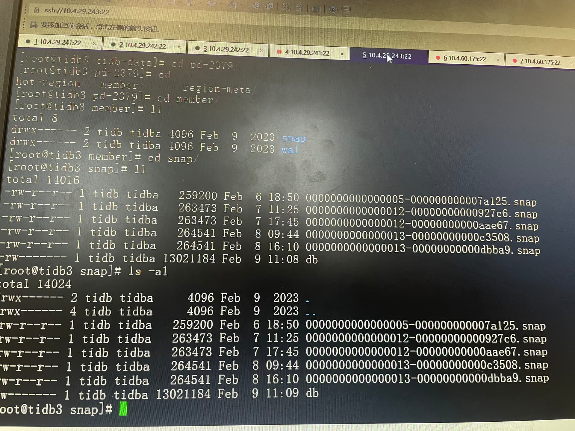 其他能够正常启动的pd节点的相同目录下也跟故障节点相同00000000000000xx-00000000000xxxxx.snap文件并没有以snap.db结尾的文件