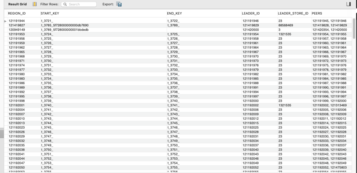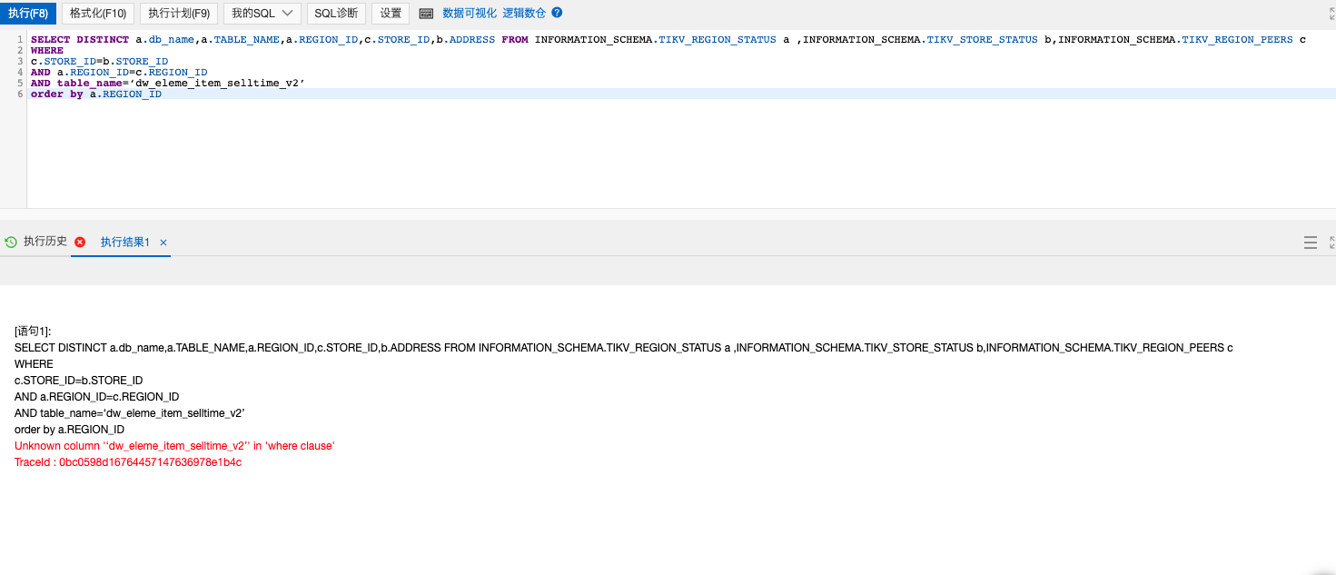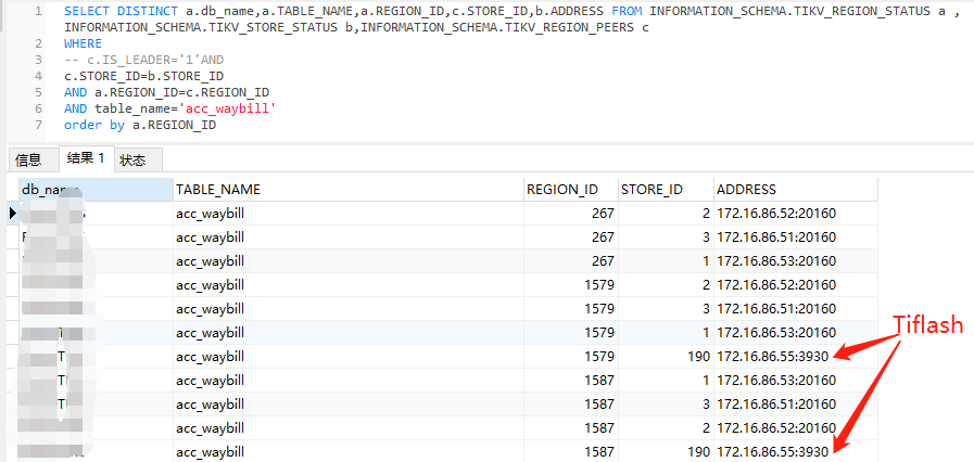SELECT DISTINCT a.db_name,a.TABLE_NAME,a.REGION_ID,c.STORE_ID,b.ADDRESS FROM INFORMATION_SCHEMA.TIKV_REGION_STATUS a ,INFORMATION_SCHEMA.TIKV_STORE_STATUS b,INFORMATION_SCHEMA.TIKV_REGION_PEERS c