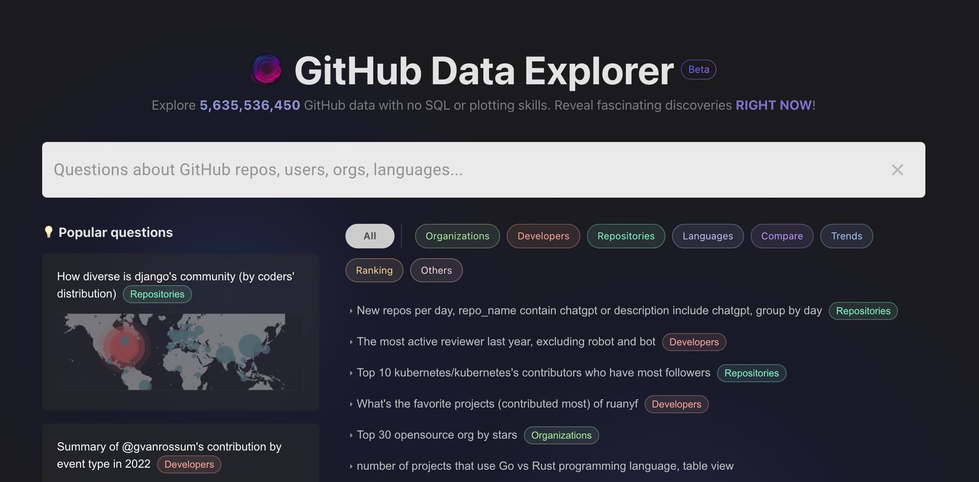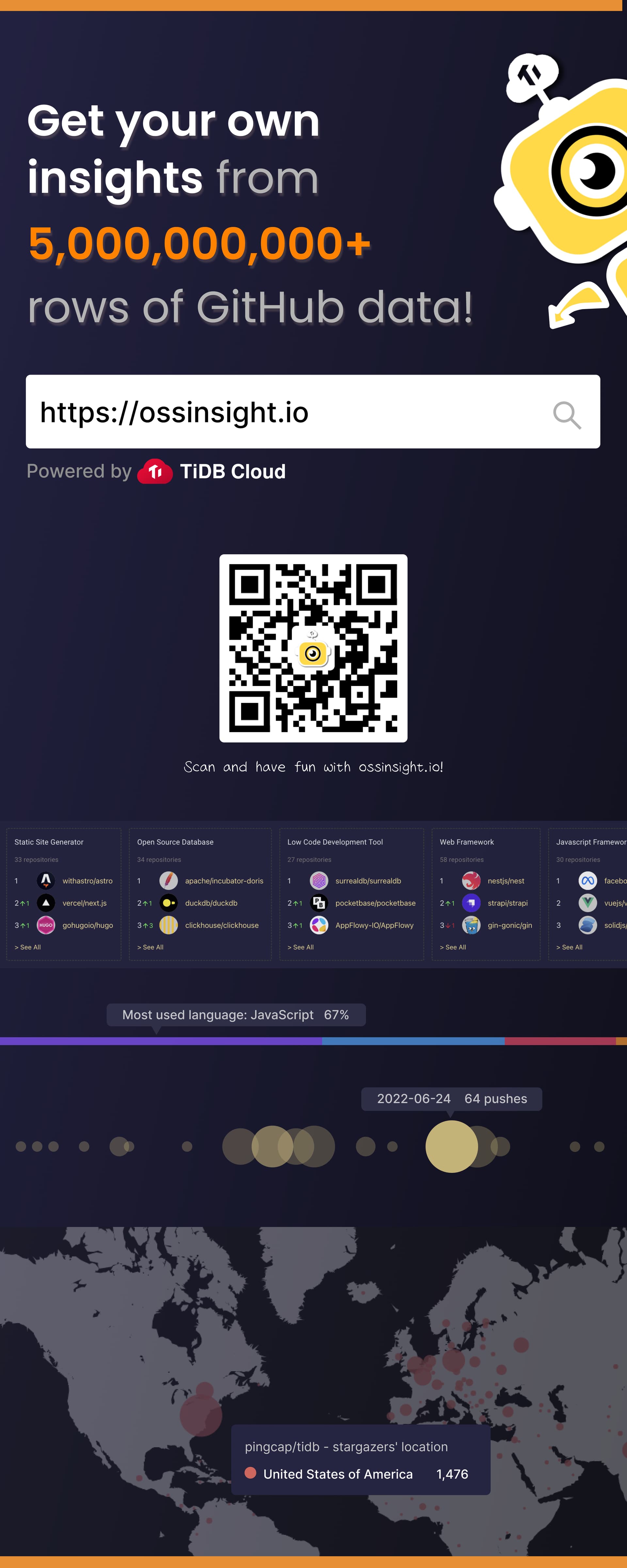OSS Insight 是基于 TiDB 实现的,一个有趣、好玩、功能强大的开源洞察工具。它可以帮助用户深入分析 GitHub 上任意一个代码仓库和开发者,也可以将两个代码仓库进行多维度:贡献者、代码提交情况、协作讨论情况等比较,并提供全面、有价值和趋势的开源见解。最近 OSS Insight 还基于 ChatGPT,推出了可以和 GitHub 数据实现“自然语言对话”的 Data Explorer,带你更深入地探索开源世界。