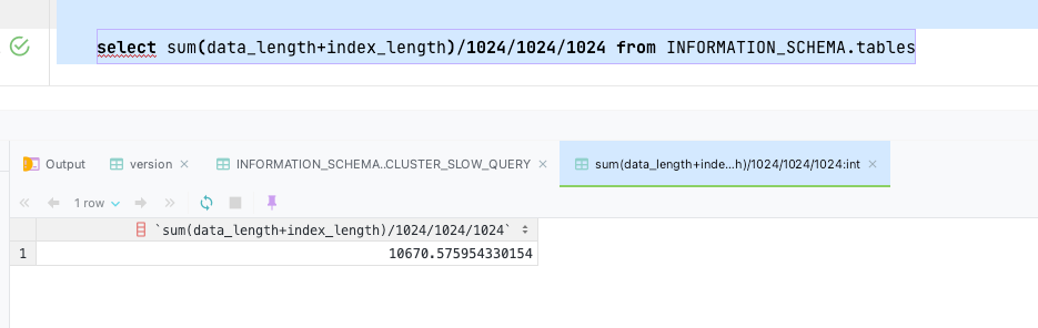 select sum(data_length+index_length)/1024/1024/1024 from INFORMATION_SCHEMA.tables;
