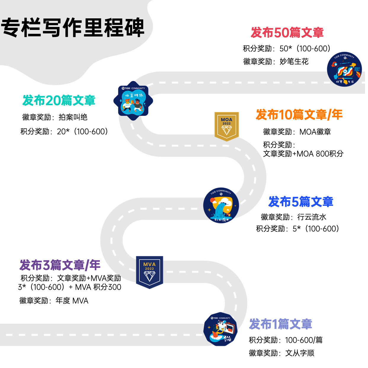 | 年度 MOA | 500 | 500 | 评选上年度 MOA 时奖励,不限次数 | 在一年内(自然年)为 TiDB 社区贡献优质技术内容达到 10 个及以上,即可当选 TiDB 社区年度 MOA。 |