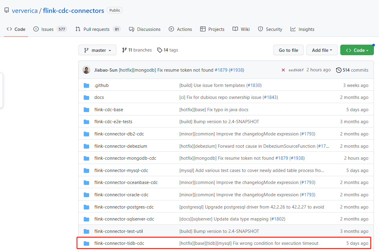 flink cdc 对于 tidb 的connector 的处理,并不是tidb 官方的出品,你的问题需要去 flink 和 flink cdc 的github 上去提 issue了