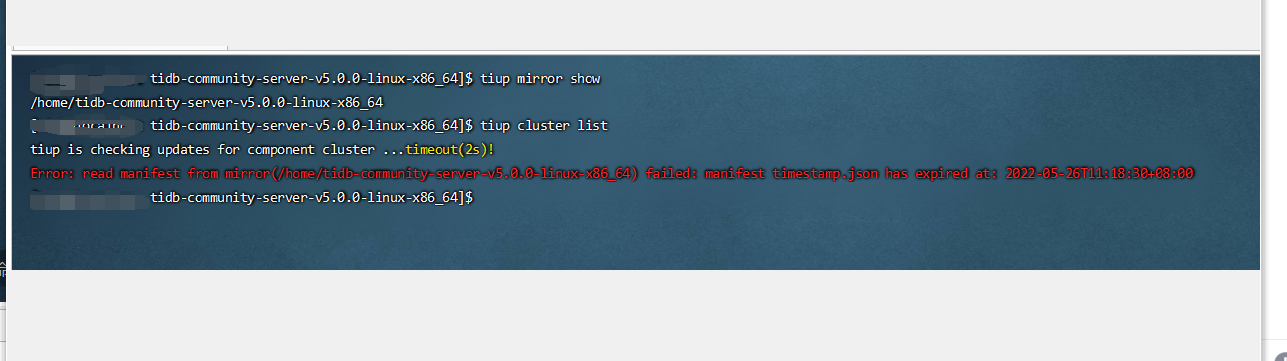 重新指定镜像,tiup mirror set /home/tidb-community-server-v5.0.0-linux-x86_64 。