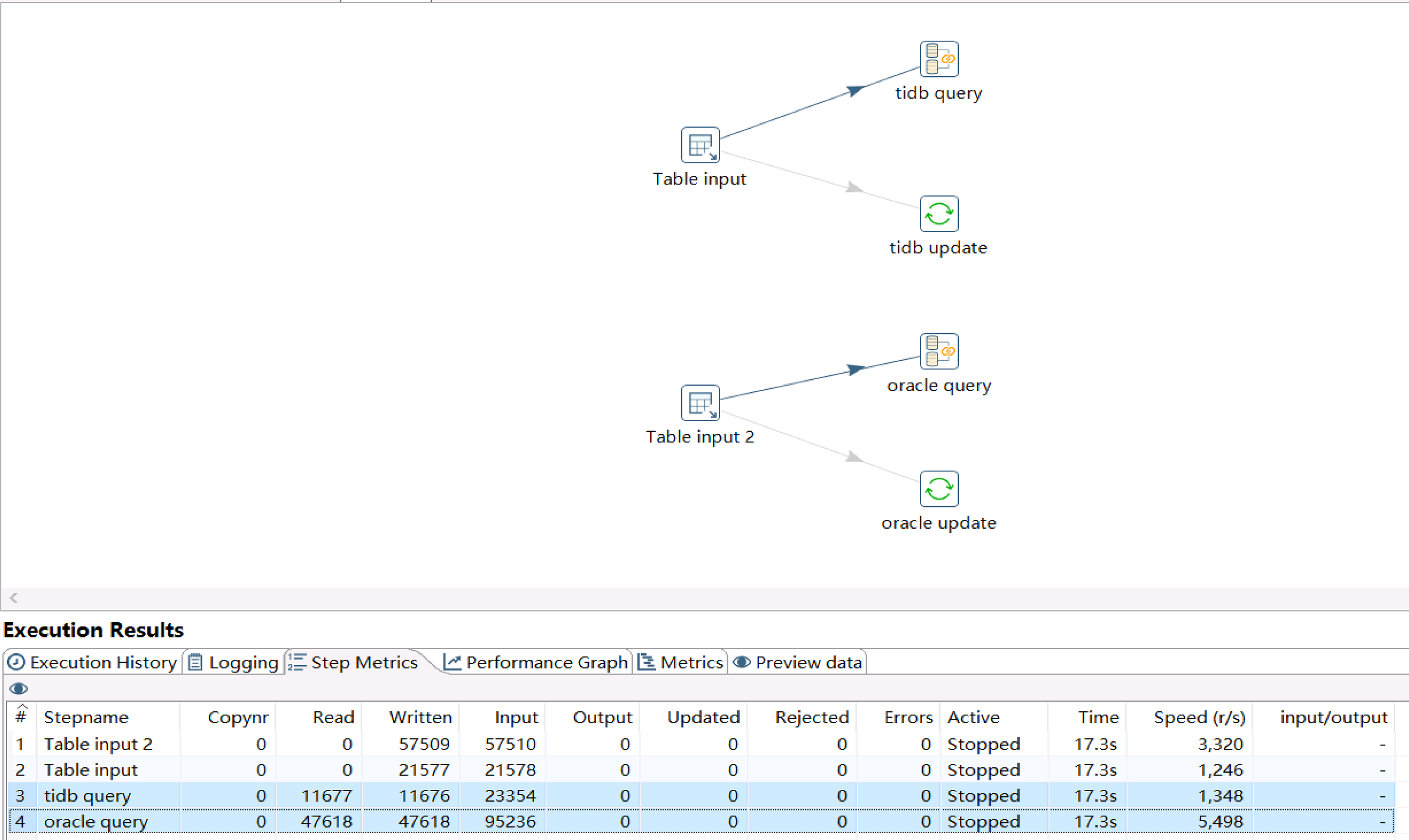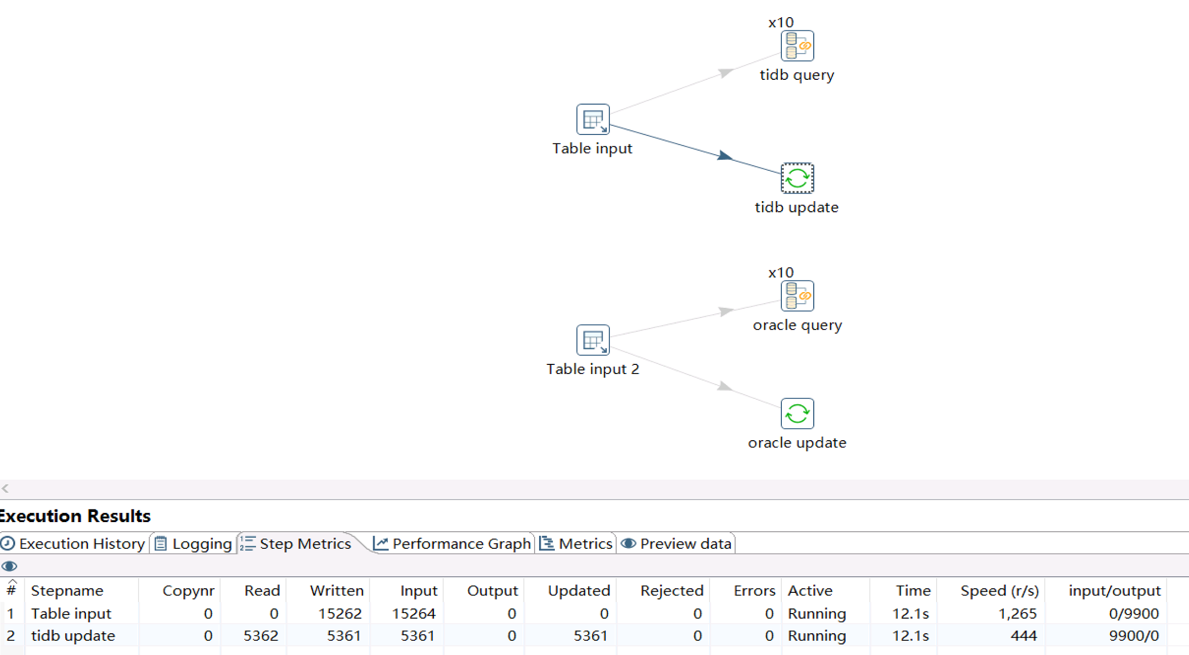 第二个测试关于update操作,在使用主键id查询数据,并更新其中两个字段时,单个连接下,oracle更新速度约5k/s,tidb速度为500/s。若提高连接数量,oracle行为和插入时基本一致——单连接速度被平分到多个连接中。但对于tidb,多个连接同时更新时,总体速度并没有提升,原先单连接的的速度也被平分至了多个连接中。