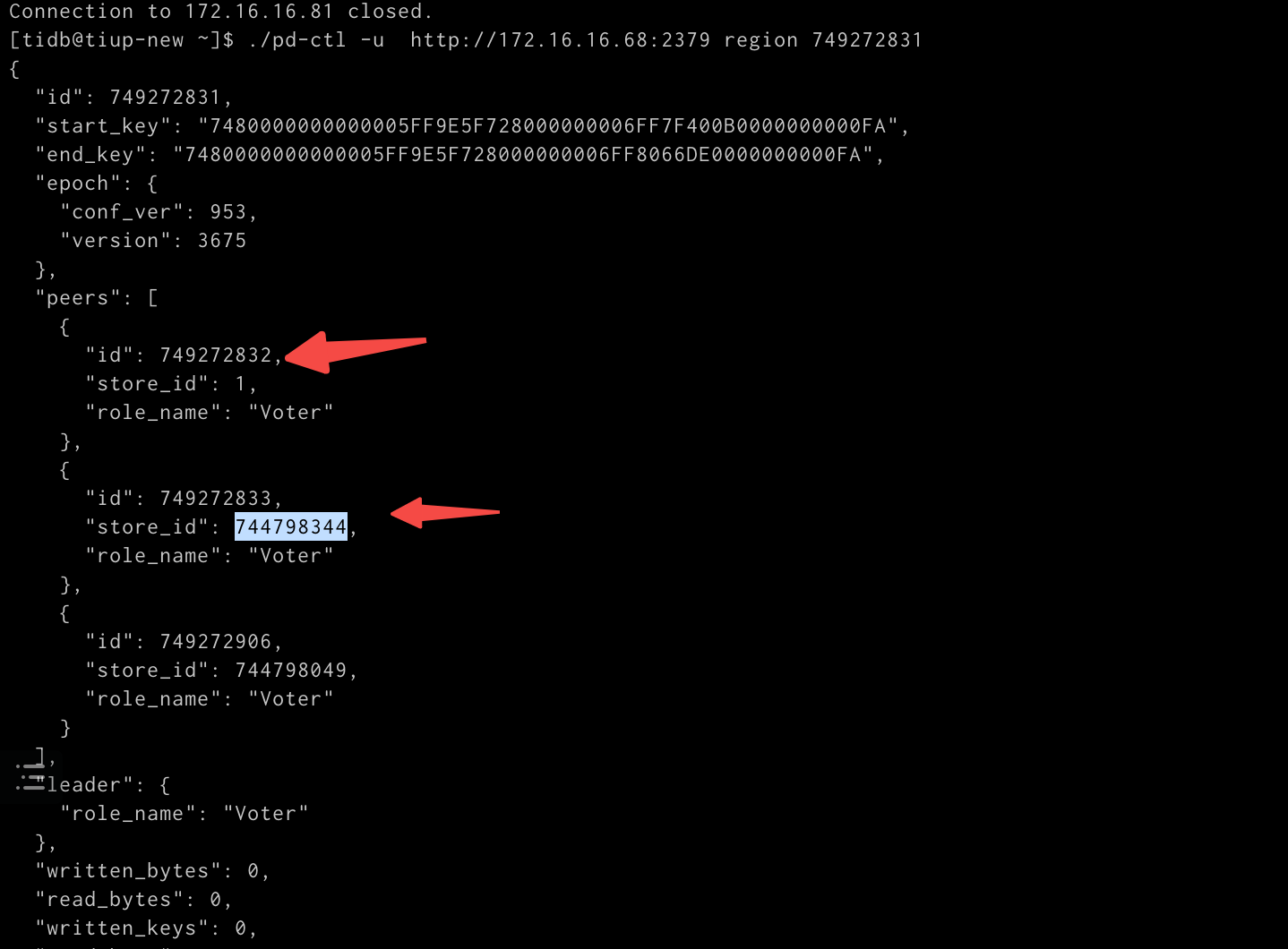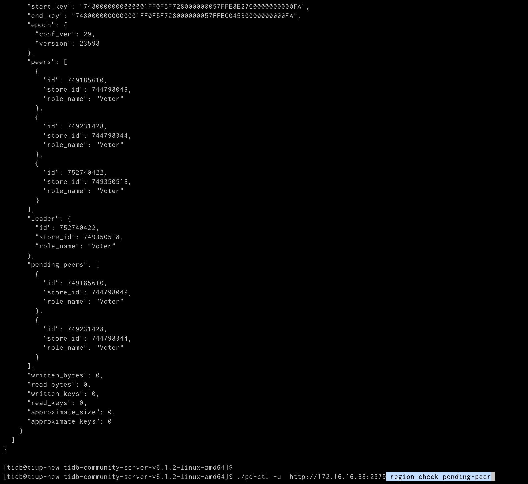 pd-ctl region --jq=‘.regions[]|select(has(“leader”)|not)|{id: .id,peer_stores: [.peers[].store_id]}’
