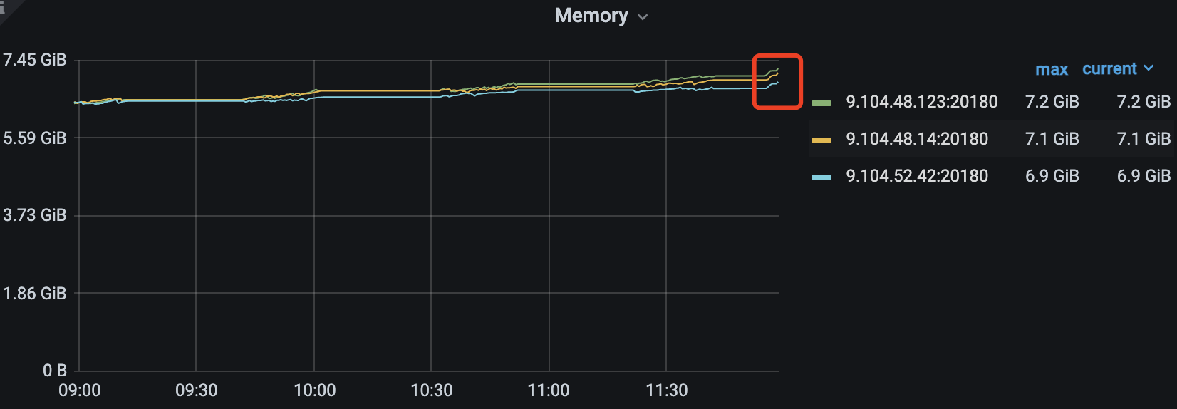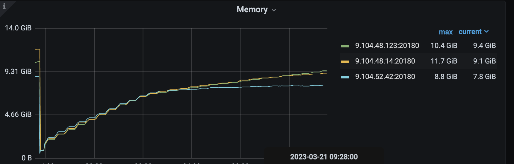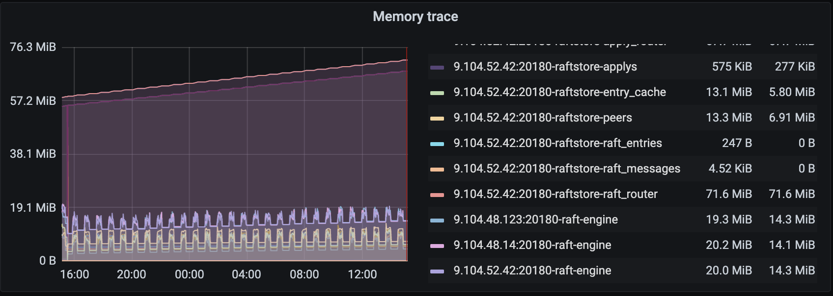 补充限制,限制了raft_engine.memory_limit = 1GB,server.grpc-memory-pool-quota= 2G, block_cache_capacity = 4G, memory_usage_limit = 8G, 理论来说 1+2+8 最大内存应该是11GB,如果超过集群静默情况下超过这个值,而且随着写入仍然内存仍然疯涨的话,就可以确认出现内存泄漏了。