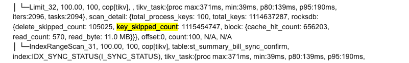 │ └─IndexRangeScan_38, 7656372.52, 503708, cop[tikv], table:st_summary_bill_sync_confirm, index:IDX_SYNC_STATUS(I_SYNC_STATUS), tikv_task:{proc max:455ms, min:60ms, p80:149ms, p95:210ms, iters:2589, tasks:2094}, scan_detail: {total_process_keys: 503708, total_keys: 107064050, rocksdb: {delete_skipped_count: 8864, key_skipped_count: 107225632, block: {cache_hit_count: 62788, read_count: 299, read_byte: 18.2 MB}}}, range:[0,0], keep order:false, N/A, N/A