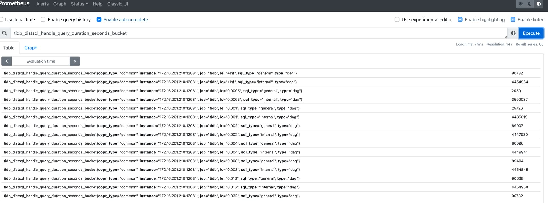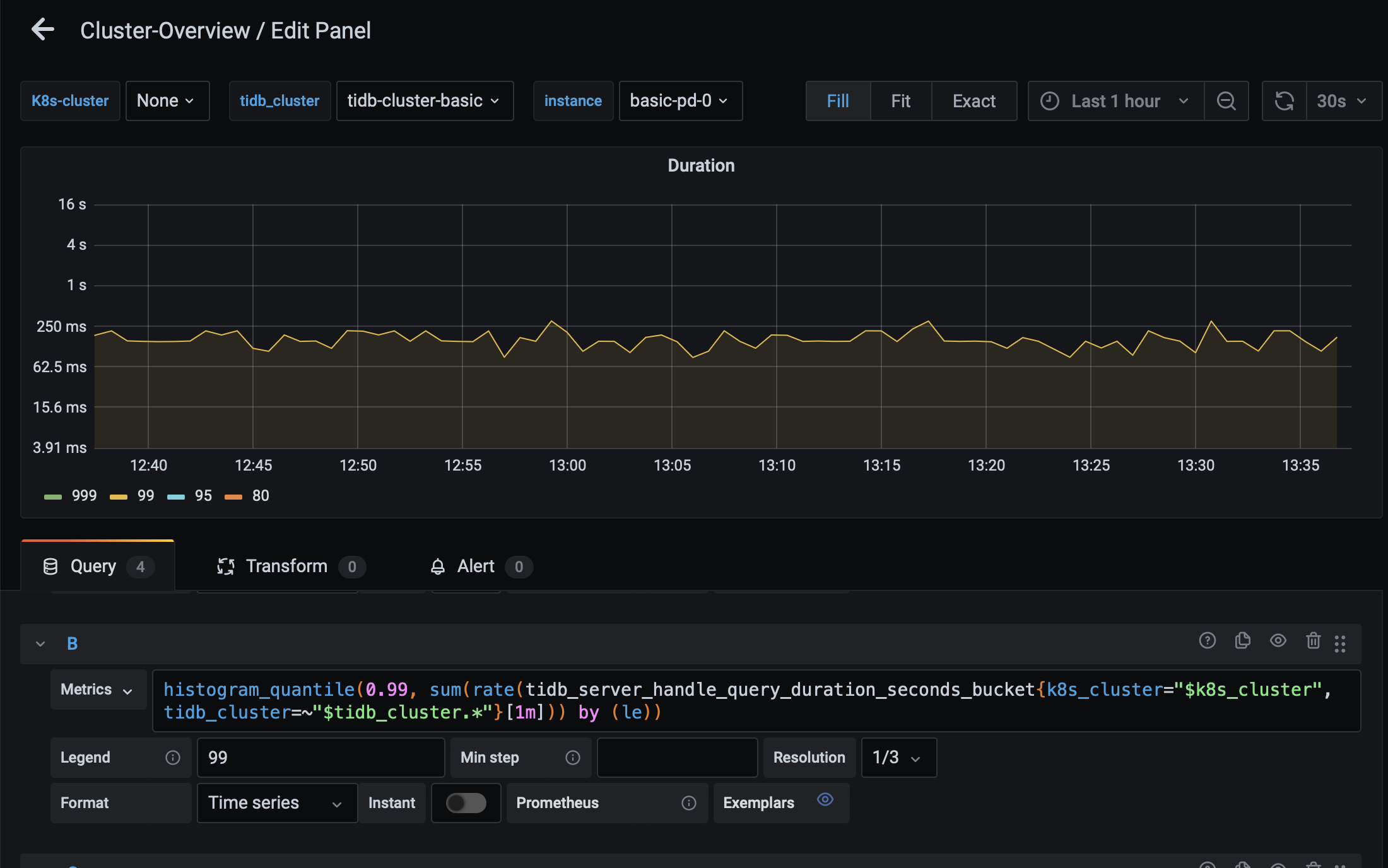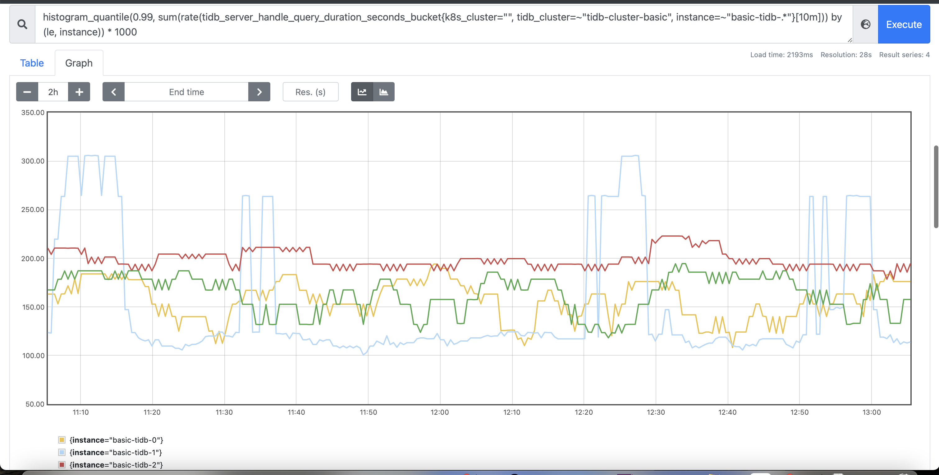 histogram_quantile(0.99, sum(rate(tidb_server_handle_query_duration_seconds_bucket{k8s_cluster=“”, tidb_cluster=~“tidb-cluster-basic”, instance=~“basic-tidb-.*”,sql_type !=“internal”}[10m])) by (le, instance)) * 1000