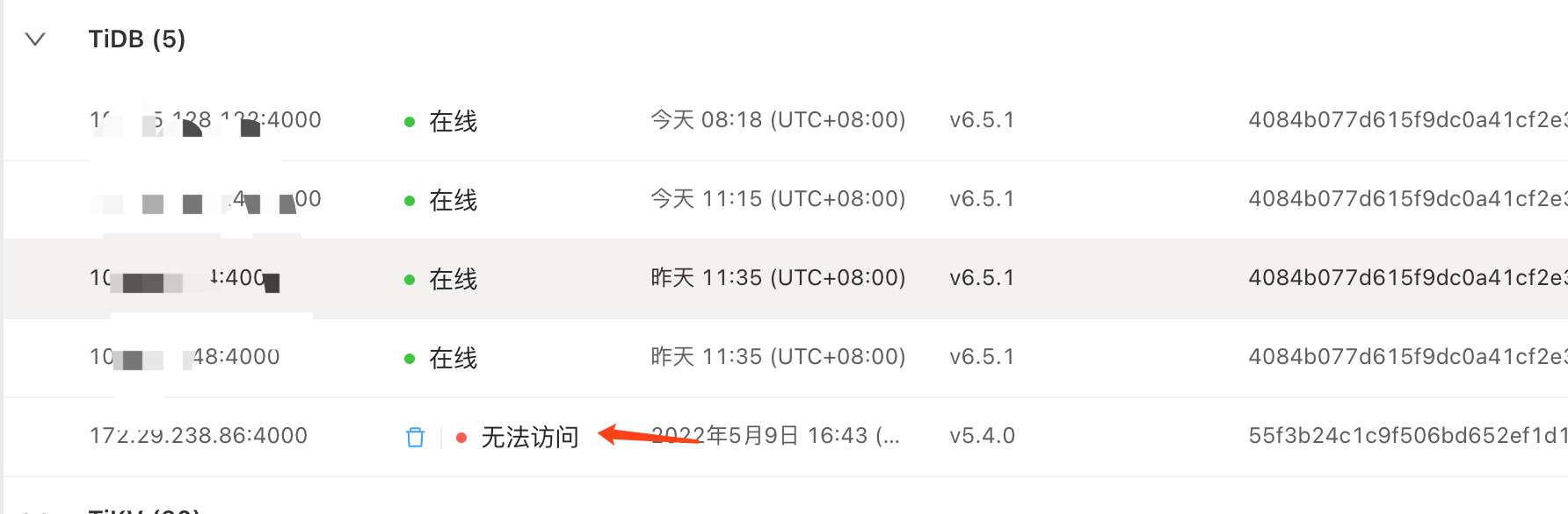 [2023/04/07 16:02:46.979 +08:00] [WARN] [scraper.go:236] ["retry to scrape component"] [component="{\"name\":\"tidb\",\"ip\":\"10.105.128.164\",\"port\":5740,\"status_port\":10132}"] [retried=3]
