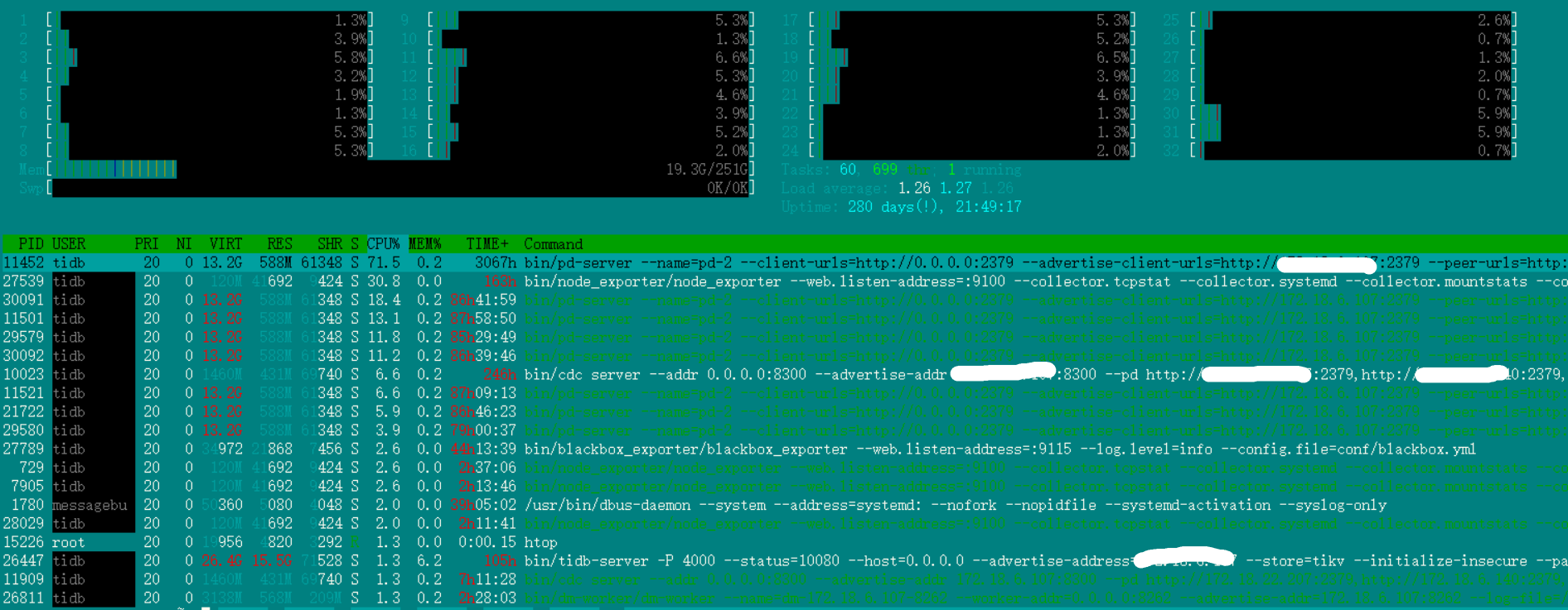 pd和tidb,dm的worker还有cdc都部署在一起,dm有一个任务的source在这个ip上