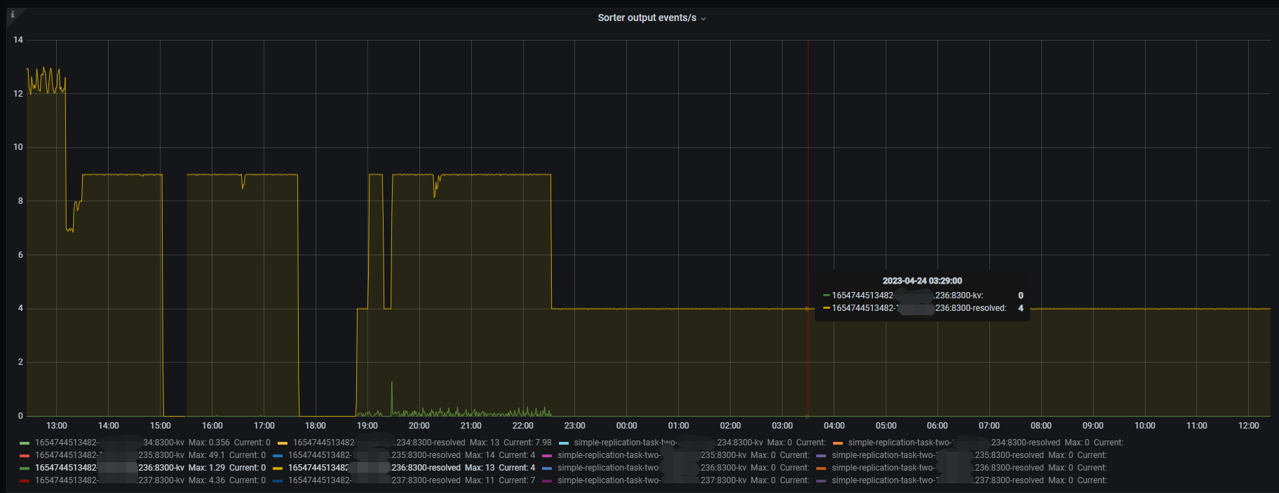 之前看sorter在磁盘中的数据特别大,本以为是磁盘性能的问题导致sorter不输出event,于是将sorter存储到磁盘的阈值调高,现在sorter全部在内存中排序,但是还是没有kv event输出,只有零星的几个resolved event输出