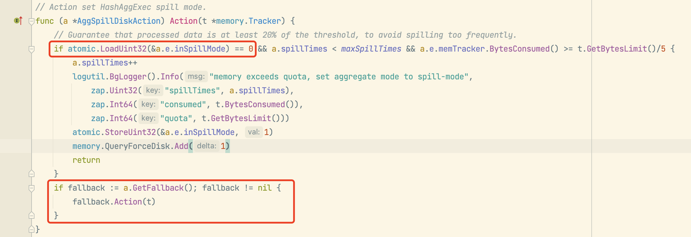 可以看到在做hashAgg时候最大溢出到磁盘的次数为:spillTimes=1,只有一次。在其落盘行为定义中需要超过10次落盘(maxSpillTimes)才会回退到oom-action=cancel(DefPanicPriority最低优先级),否则会优先进行落盘(DefSpillPriority)。相关代码: