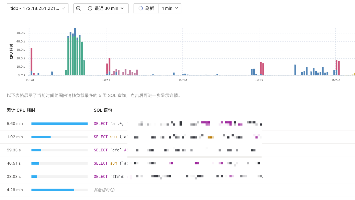 不过,你可以可以先display看下集群分布,如果是慢SQL已经都kill了,还是只有某台TiKV节点CPU高,那大概率是遇到热点了(高频的小查询)。可以在tidb-dashboard的topSQL面板,选到CPU高的那个TiKV节点,看是哪类SQL占用CPU高。