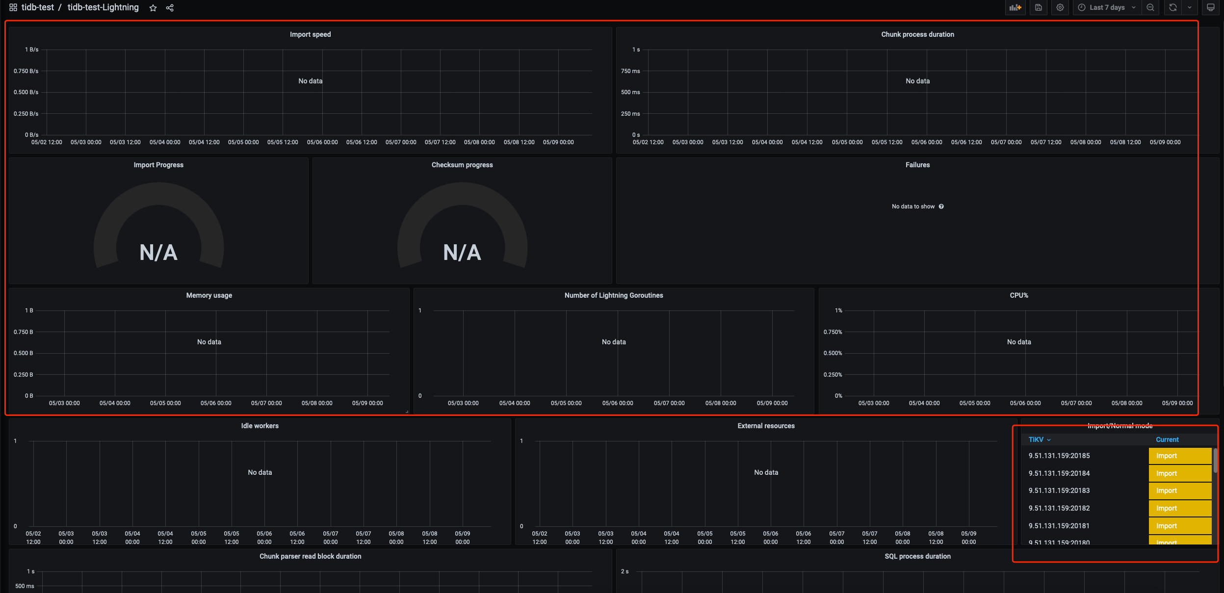 检查Grafana是否正确地连接到Prometheus。您可以在Grafana的数据源设置中检查是否正确地配置了Prometheus的地址和端口。如果您使用的是TiDB Lightning的默认端口,那么Prometheus的地址应该是http://<tidb-lightning-ip>:9090。