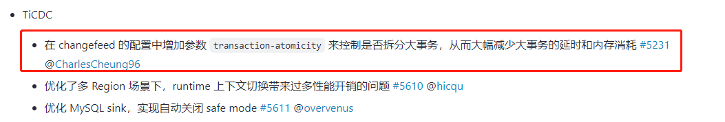 从 v6.2 版本起,你可以通过配置 sink uri 参数 transaction-atomicity 来控制 TiCDC 是否拆分单表事务。拆分事务可以大幅降低 MySQL sink 同步大事务的延时和内存消耗。
