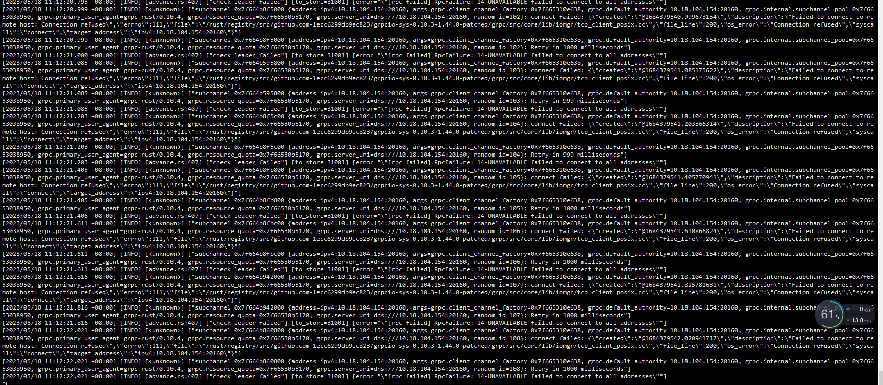 [2023/05/18 10:56:26.271 +08:00] [INFO] [region_cache.go:2539] ["[health check] check health error"] [store=10.18.104.161:20160] [error="rpc error: code = Unavailable desc = connection error: desc = \"transport: Error while dialing dial tcp 10.18.104.161:20160: connect: connection refused\""]